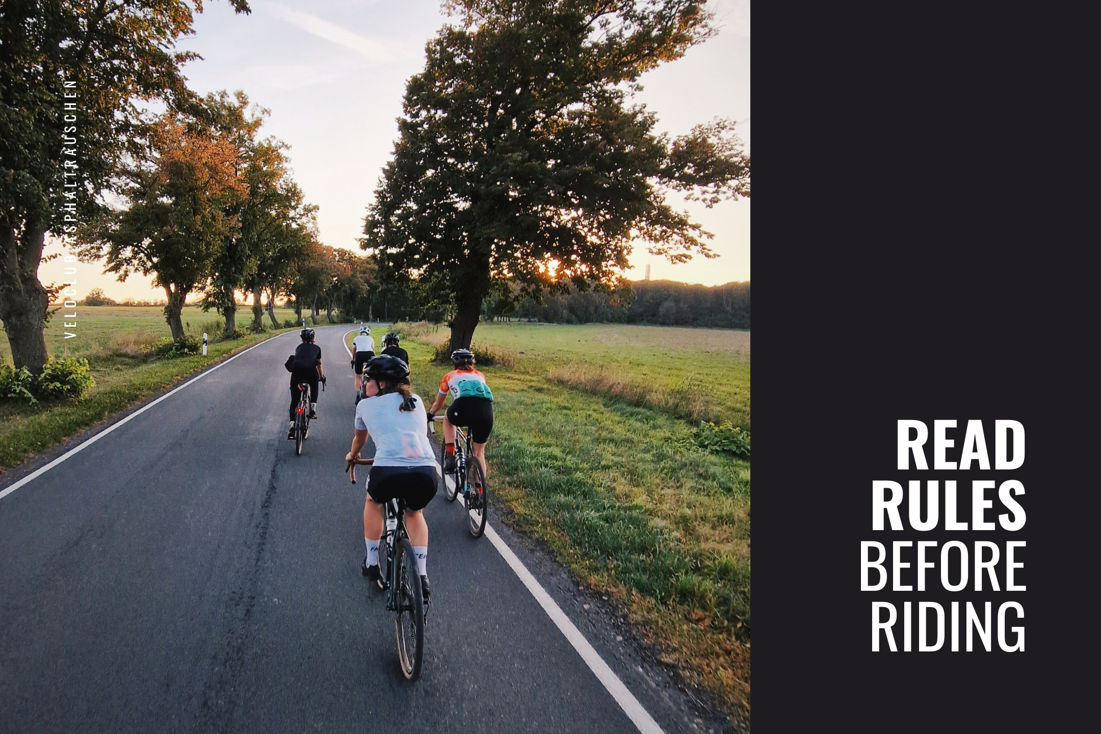 Helmpflicht – ohne Helm, keine Teilnahme. Dein Fahrrad hat zwei Bremsen – keine Vorderrad- / Hinterradbremsen, keine Teilnahme. Fahr dein Tempo (bei Bergfahrten wird oben gewartet) und sag Bescheid, wenn die Gruppe zu schnell ist. Wenn erforderlich: Lampen, vorne und hinten.